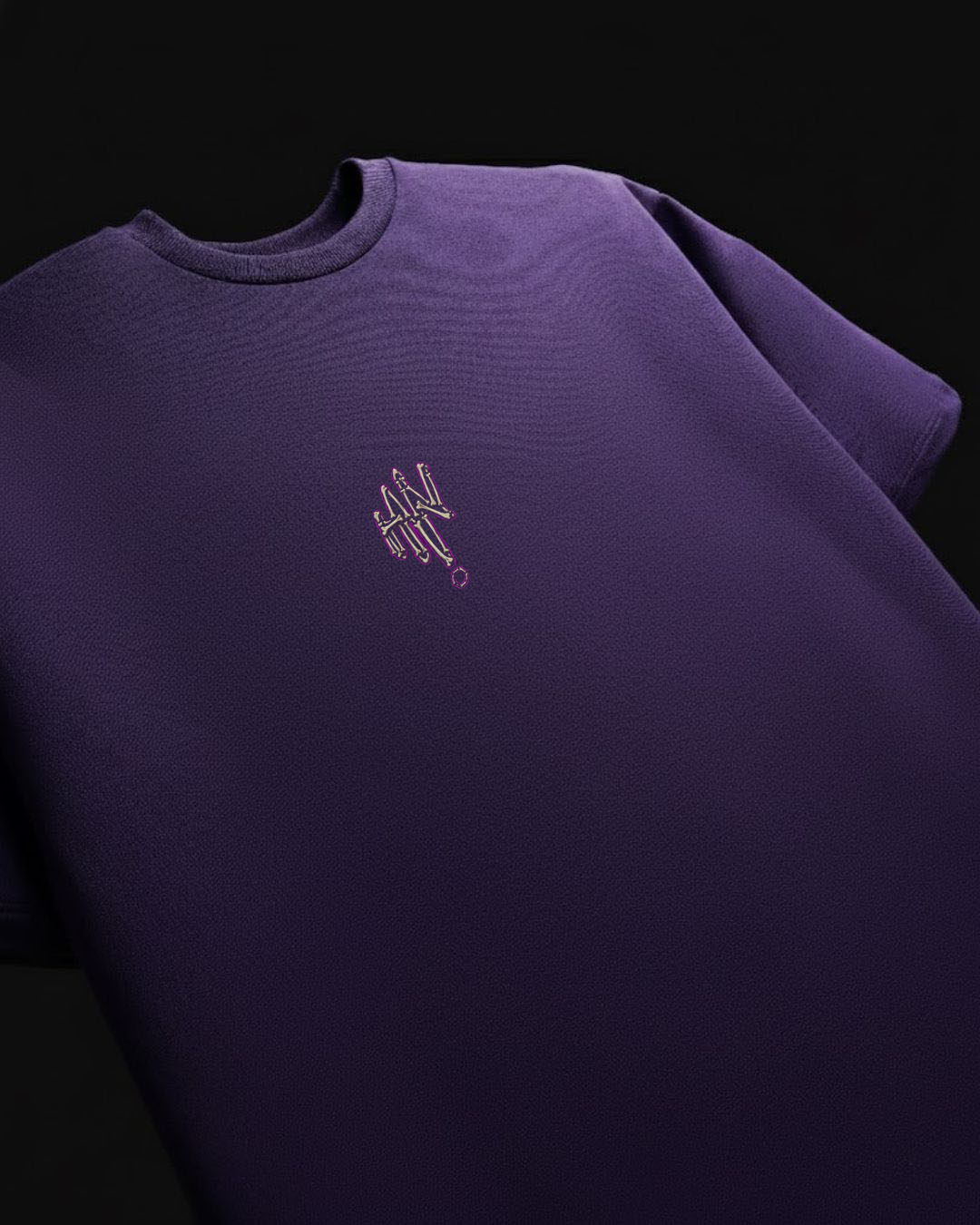The logo is a small, abstract, embroidered symbol on a deep purple T-shirt.