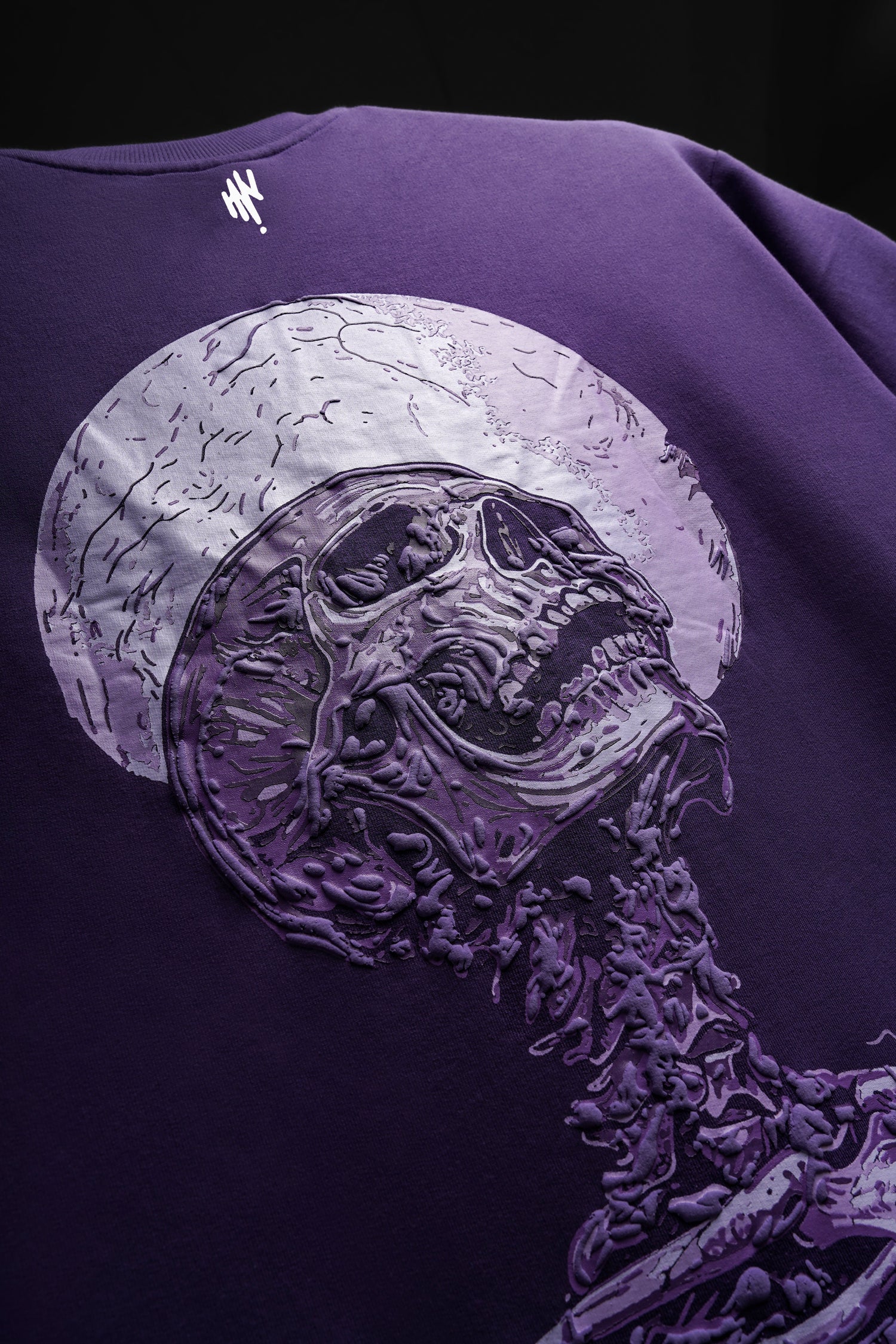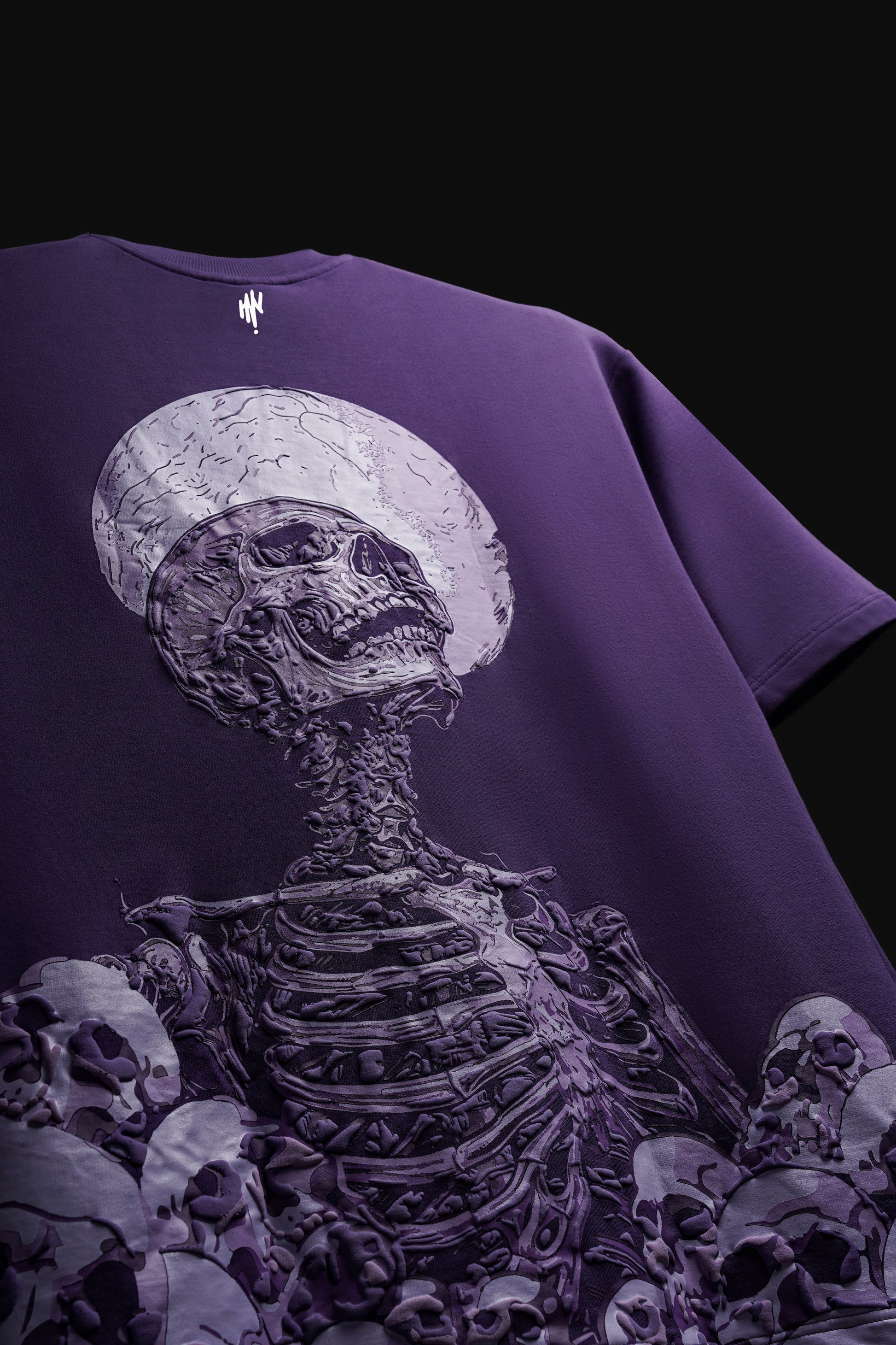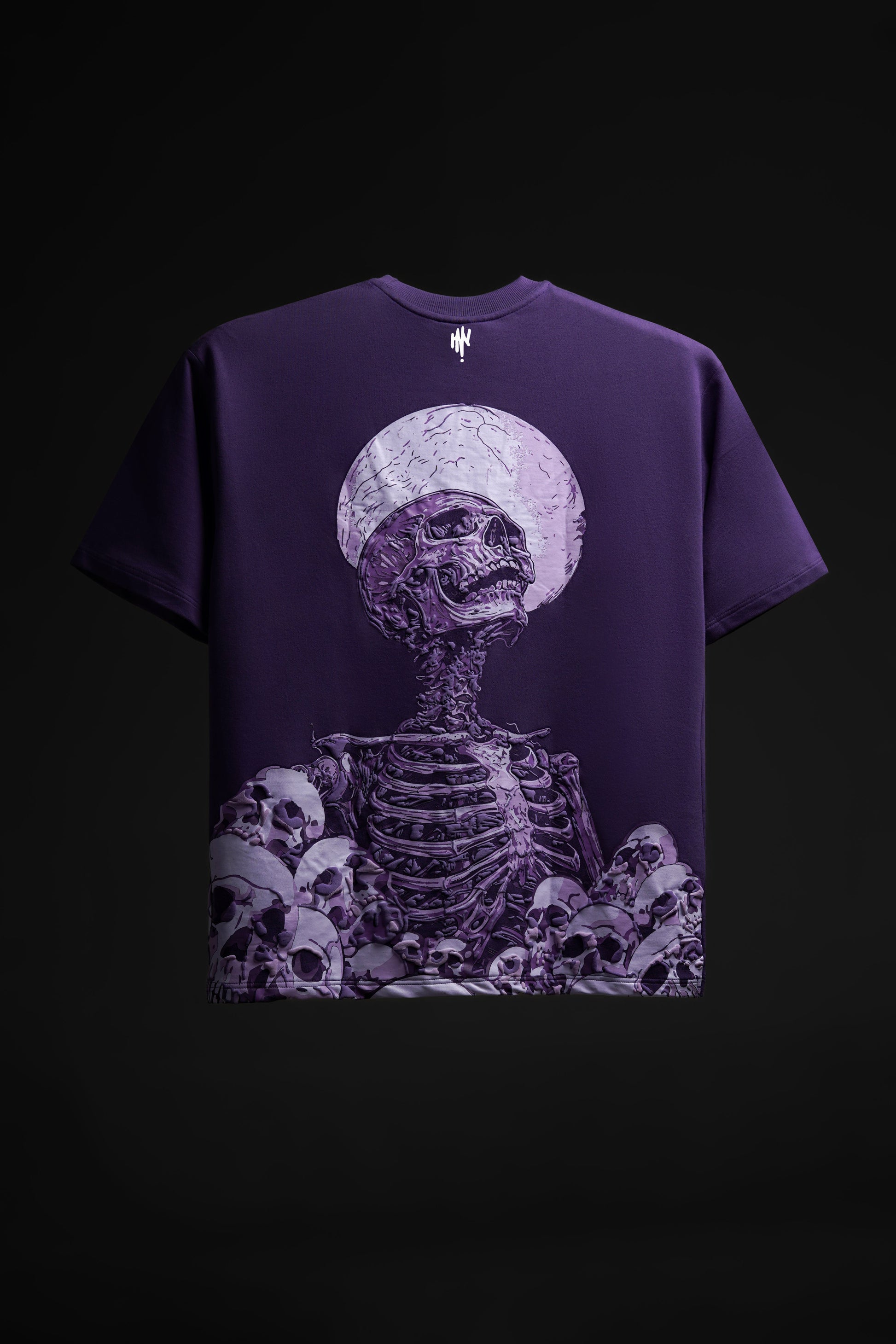 The graphic is a skeleton skull rendered in shades of lighter purple and off-white. The skull is positioned dramatically, looking up toward a large, textured full moon printed directly behind it.